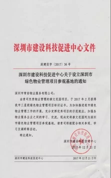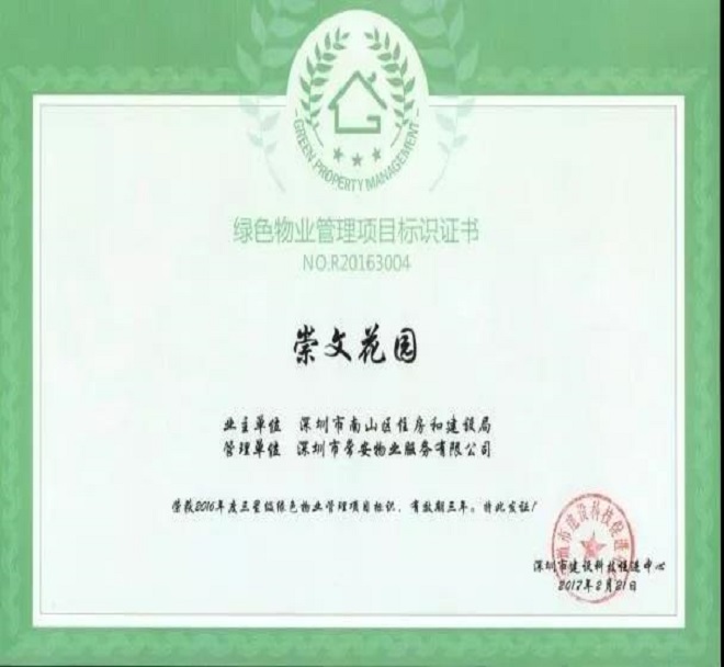 依據(jù)2011 年深圳出臺(tái)的首部《深圳市綠色物業(yè)管理導(dǎo)則(試行)》和 2013 年出臺(tái)的《深圳市綠色物業(yè)管理項(xiàng)目評(píng)價(jià)辦法和細(xì)則(試行)》,常安物業(yè)積極響應(yīng)并開(kāi)展綠色物業(yè)管理工作,2016 年至今,共有四個(gè)項(xiàng)目榮獲了深圳市政府部門頒發(fā)的綠色物業(yè)管理項(xiàng)目證書,其中崇文花園還被深圳市政府部門列為深圳市綠色物業(yè)管理項(xiàng)目參觀基地,2019年出任廣東省綠色供應(yīng)鏈協(xié)會(huì)綠色物業(yè)管理專業(yè)委員會(huì)副主任委員單位。色物業(yè)管理
