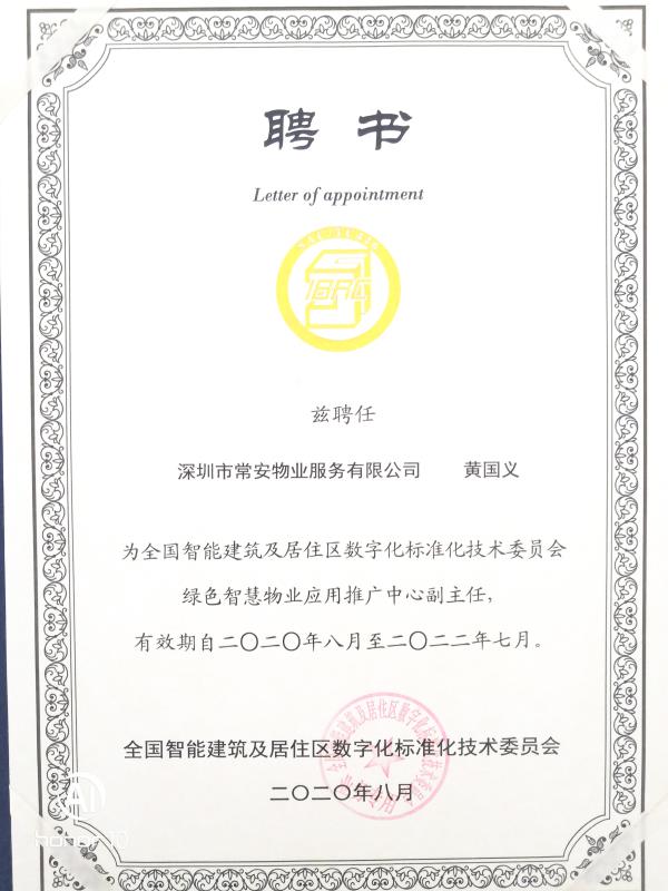會上,常安物業(yè)公司副總經(jīng)理黃國義獲聘為全國智能建筑及居住區(qū)數(shù)字化標準化技術(shù)委員會綠色智慧物業(yè)應用推廣中心副主任。